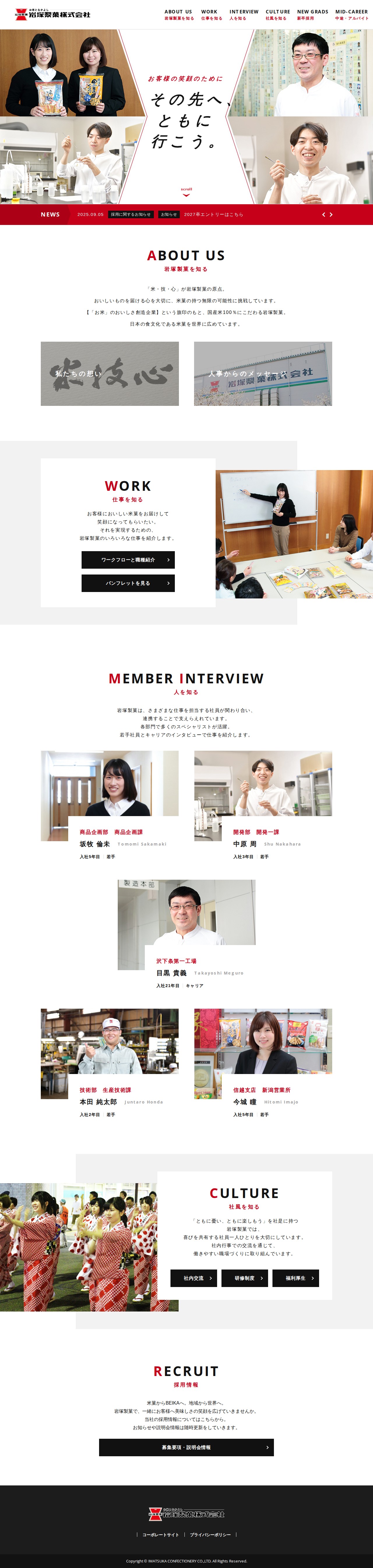 This page is the recruitment site of Iwatsuka Confectionery Co., Ltd. The company originates from the principles of 'rice, technology, and heart,' and creates delicious rice crackers using 100% domestic rice. It aims to spread Japanese food culture worldwide. The site provides information on new graduate and mid-career recruitment, company overview, job descriptions, employee interviews, and company culture. Under the vision of 'smiles for customers,' diverse specialists work together across departments. The company is committed to creating a comfortable workplace through various internal activities, training programs, and benefits.