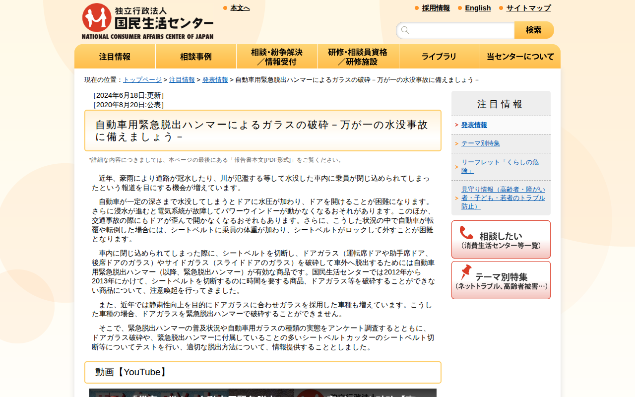 自動車用緊急脱出ハンマーによるガラスの破砕-万が一の水没事故に備えましょう-(発表情報)_国民生活センター