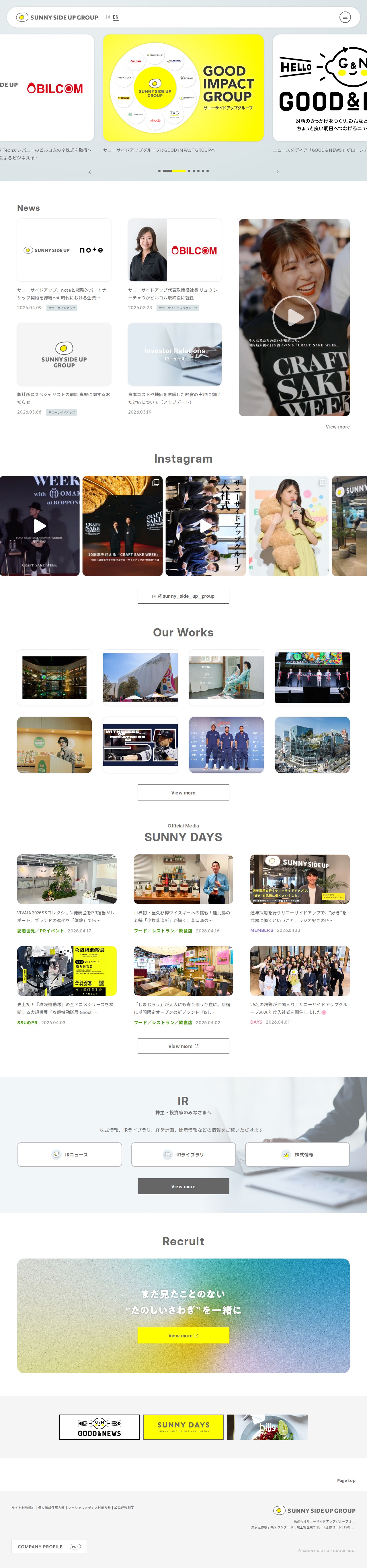 This page is the official website of Sunnyside Up Group, a PR and communications company. The group has strengthened its digital solutions business through acquiring all shares of PR Tech company Builcom and establishing a strategic partnership with Note. The company is rebranding to GOOD IMPACT GROUP and has obtained B Corp certification. It has launched an AI Dialogue & Relations Team and launched the news media "GOOD & NEWS." Through various initiatives and events, the company supports corporate brand value enhancement in the AI era while emphasizing social impact.