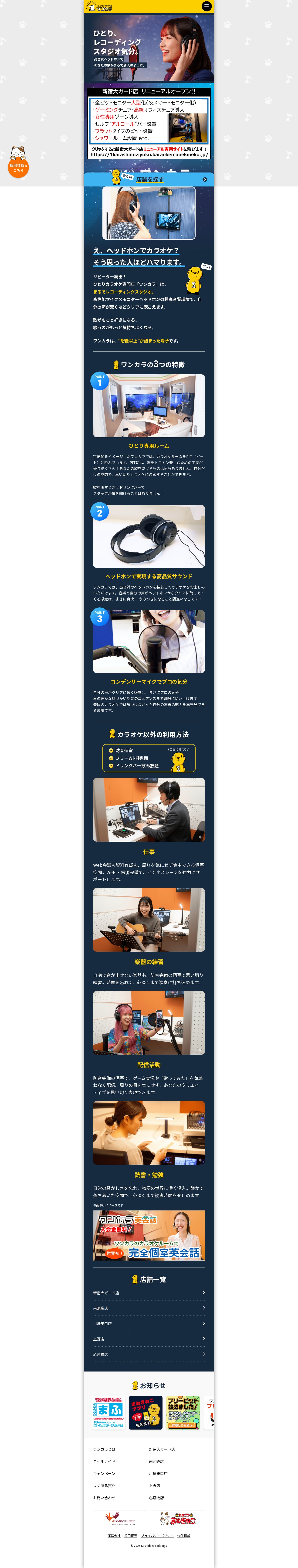 This page introduces "Wan Kara," a solo karaoke specialty shop featuring a professional recording studio experience. Customers wear high-quality headphones and use condenser microphones to hear their voices clearly in private soundproof rooms called "PITs." The space allows users to focus entirely on singing without interruption. Beyond karaoke, these rooms can be used for web conferences, instrument practice, streaming, and studying. Locations include Shinjuku, Ikebukuro, Kawasaki, Ueno, and Shinsaibashi.
