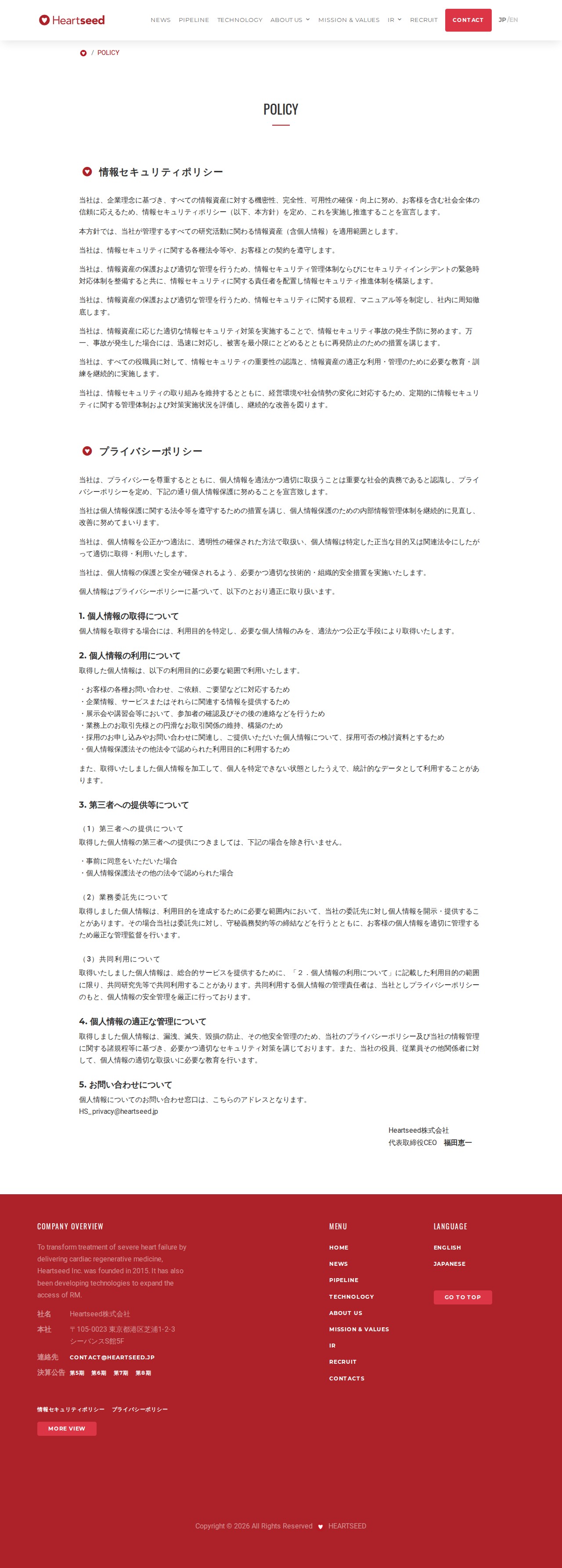 This page outlines Heartseed Inc.'s Information Security Policy and Privacy Policy. The company commits to protecting the confidentiality, integrity, and availability of all information assets while maintaining social trust. It establishes a comprehensive security management system and continuously improves internal controls for personal information protection. Personal information is collected and used only for specified purposes with minimal necessary data through lawful means. Technical and organizational safeguards are implemented. Third-party disclosure occurs only with prior consent or legal authorization. The company ensures compliance with relevant laws and regulations.