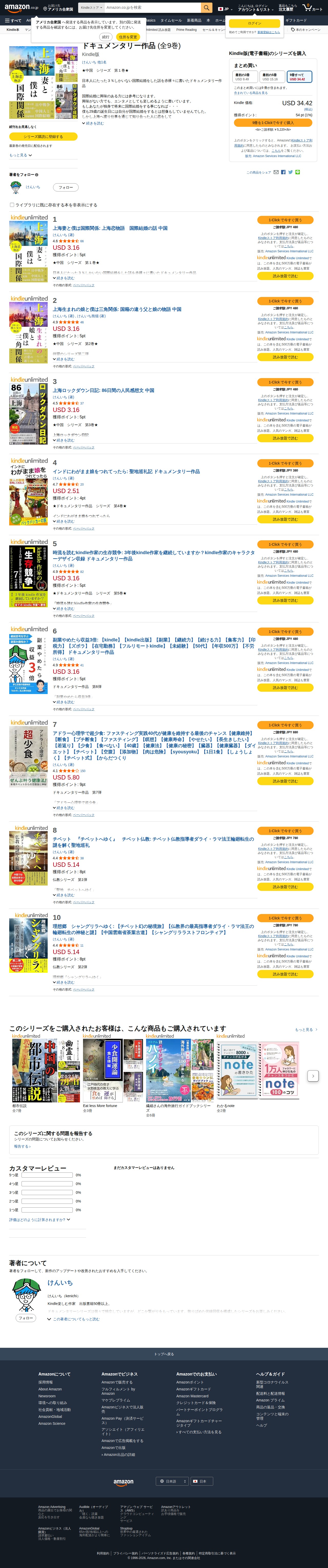 This page introduces a documentary series by author Kenichi titled "China Series Volume 1" available on Kindle. The work chronicles the author's rare international marriage experience at age 29 after meeting his Chinese wife in Shanghai, a perspective held by only 3% of Japanese. The 9-volume series covers 15 chapters spanning topics including parental impact, cultural differences between Japan and China, marriage procedures, ethnicity, and family life. Designed to be both informative for those interested in international marriage and entertaining for general readers, the complete series is available for purchase in bundled packages at various price points.