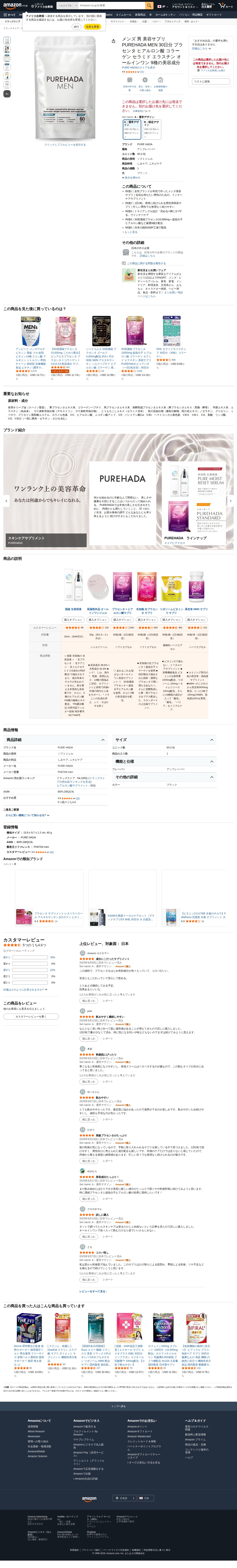 Amazon | メンズ 男 美容サプリ PUREHADA MEN 30日分 プラセンタ ヒアルロン酸 コラーゲン セラミド エラスチン オールインワン 9種の美容成分 | PURE HADA | ヒアルロン酸 - Saved screenshot