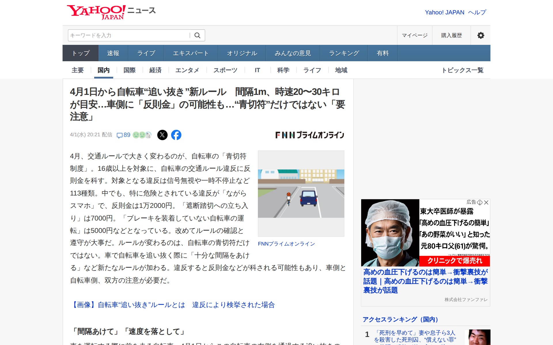4月1日から自転車“追い抜き”新ルール 間隔1m、時速20〜30キロが目安…車側に「反則金」の可能性も…“青切符”だけではない「要注意」(FNNプライムオンライン) - Yahoo!ニュース - Saved screenshot