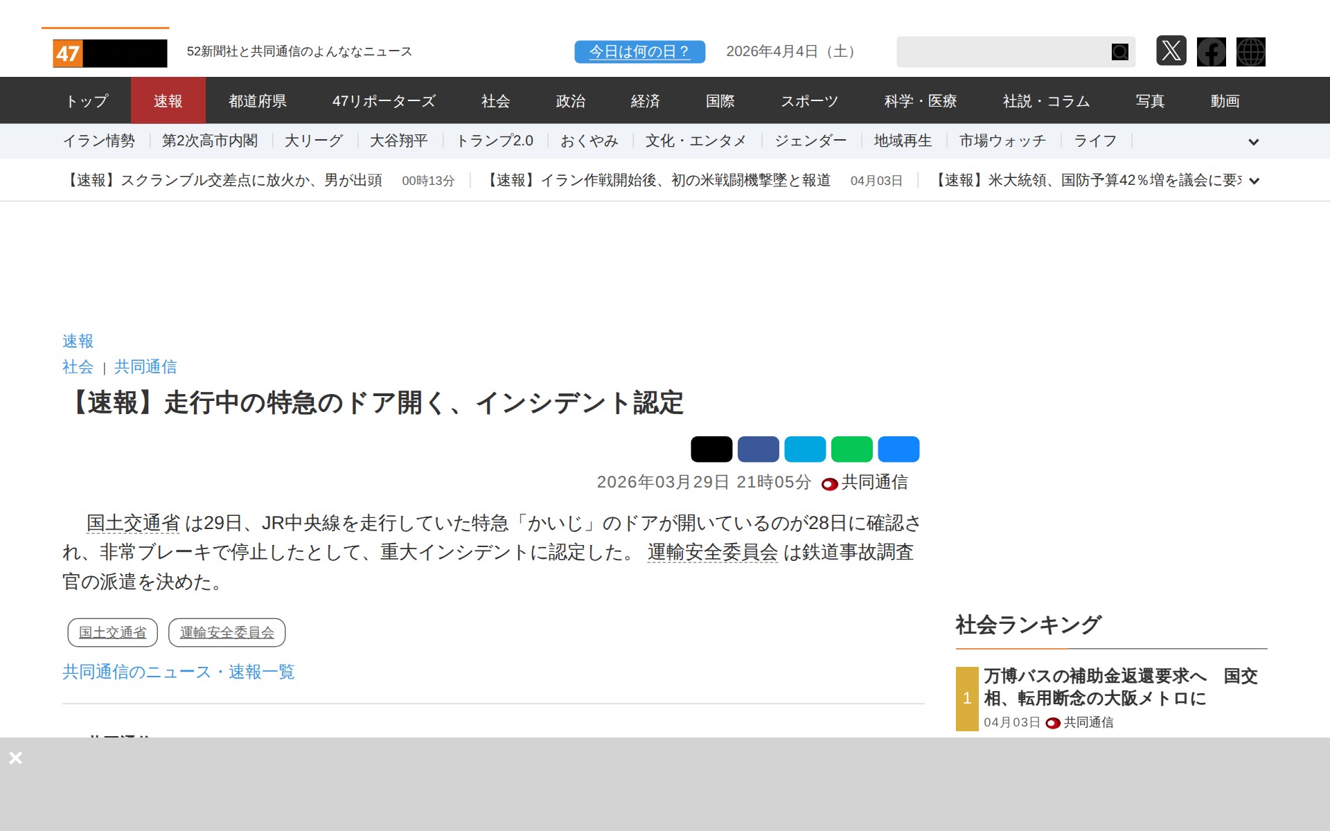 【速報】走行中の特急のドア開く、インシデント認定|47NEWS(よんななニュース) - Saved screenshot