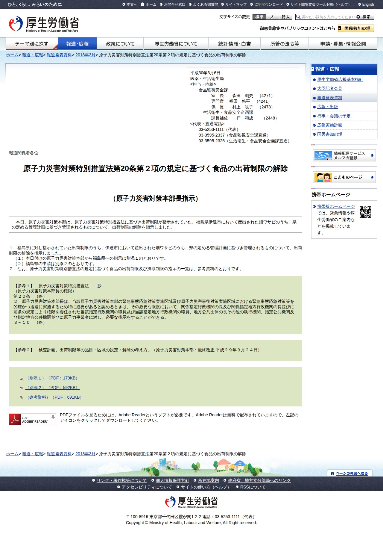 原子力災害対策特別措置法第20条第2項の規定に基づく食品の出荷制限の解除 |報道発表資料|厚生労働省 - Saved screenshot