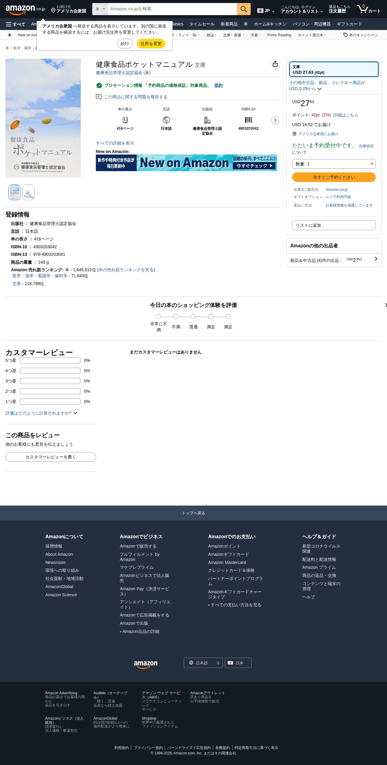 This page is an Amazon.co.jp product listing for "Health Food Pocket Manual," published by the Health Food Manager Certification Association. It is a 416-page paperback book with ISBN-10 4903203042, priced at USD 27.63 and currently available for pre-order. The book ranks 71,643rd in Medical/Pharmaceutical/Nursing/Dental categories and 218,798th in paperback books. No customer reviews have been submitted yet.