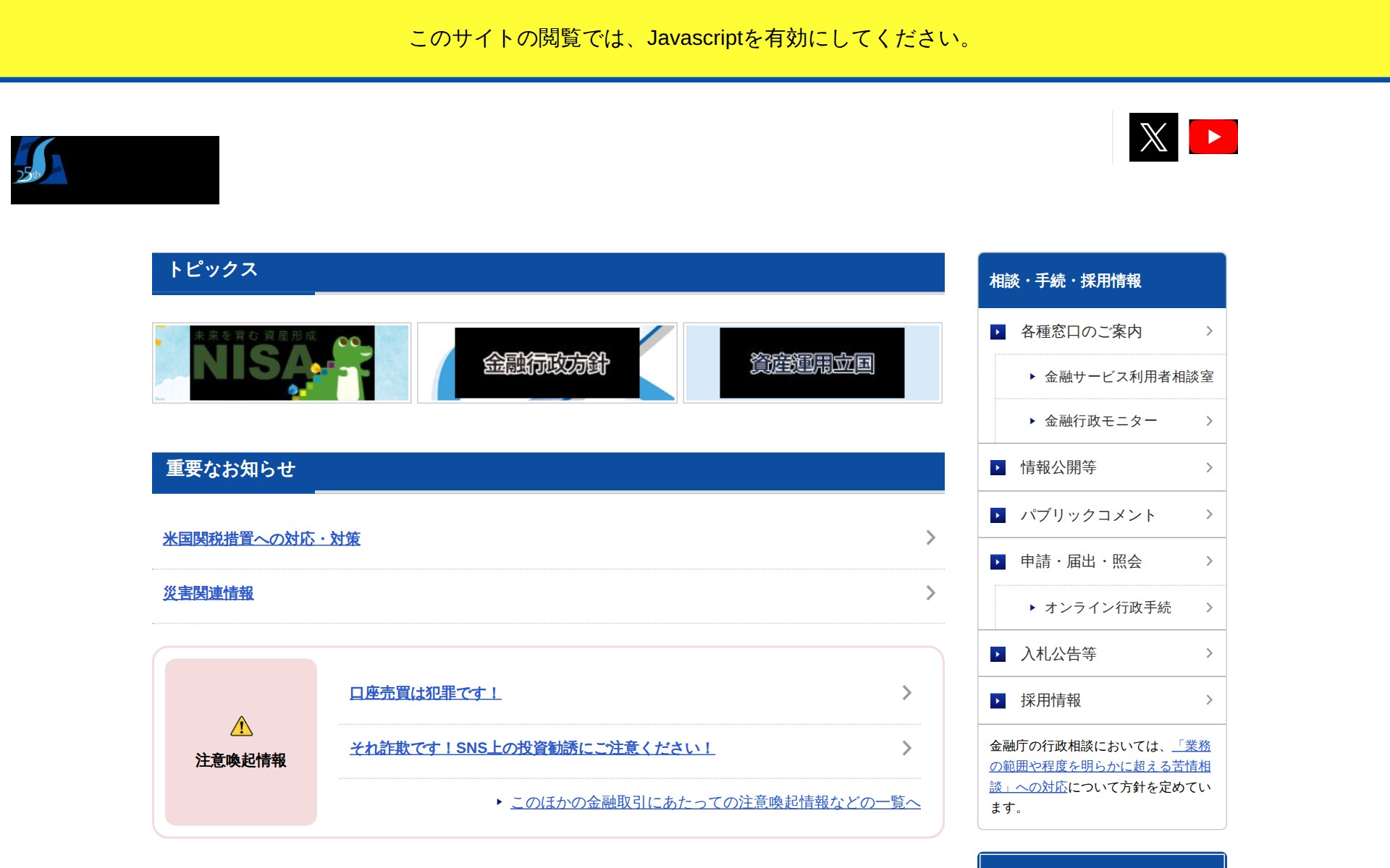 This page is the official website of Japan's Financial Services Agency (FSA). It presents key topics including financial administration policy, asset management as a national strategy, and NISA programs. The site provides latest press releases, council information, job openings, and warnings about fraud and illegal activities. It offers consultation services for financial users, a financial institution search function, and information on laws and guidelines. The FSA oversees financial institutions, protects consumers, and manages international financial cooperation.