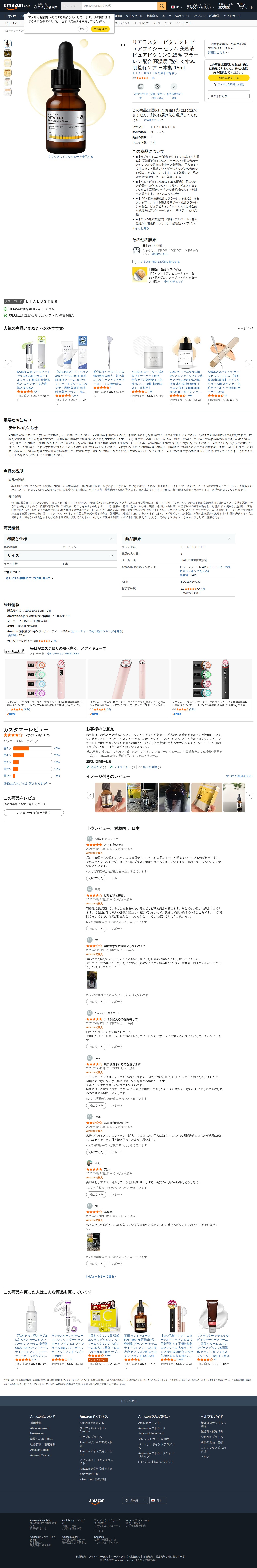 Amazon | リアラスター ビタテクト ピュアブイシー セラム 美容液 ピュアビタミンC 25% フラーレン配合 高濃度 毛穴 くすみ 肌荒れケア 日本製 15mL | LIALUSTER | 美容液 通販 - Saved screenshot