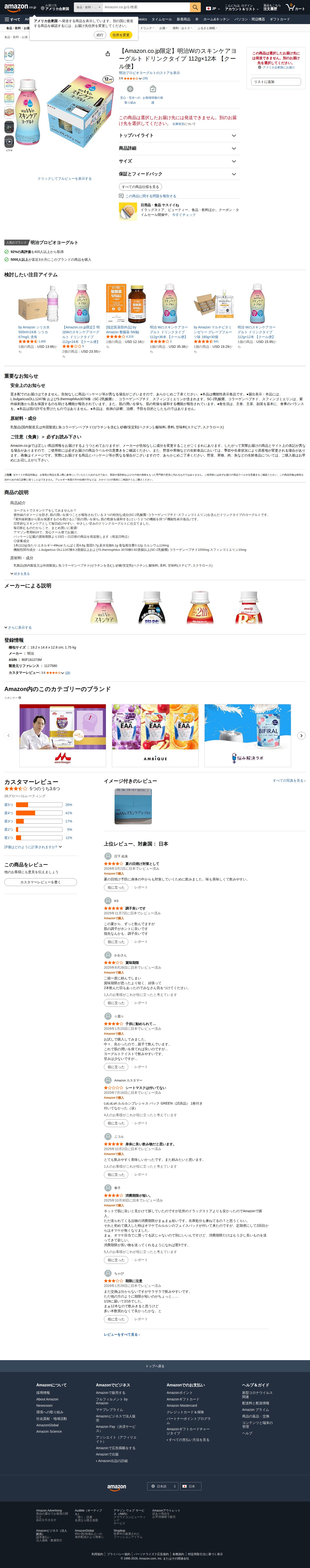 This page presents Meiji Probio Yogurt's 'W Skincare Yogurt Drink Type' (112g×12 bottles), an Amazon.co.jp exclusive product delivered via cool delivery service. It is a food with functional claims containing lactic acid bacteria strains including L.bulgaricus OLL1247. The product has a 3.6-star rating from 26 reviews. The Meiji Probio Yogurt brand maintains high customer satisfaction with substantial purchase history. Please note that shipment may not be available to certain destinations.