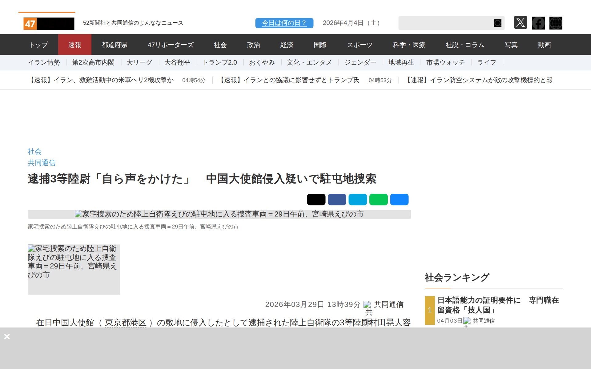 逮捕3等陸尉「自ら声をかけた」 中国大使館侵入疑いで駐屯地捜索|47NEWS(よんななニュース)