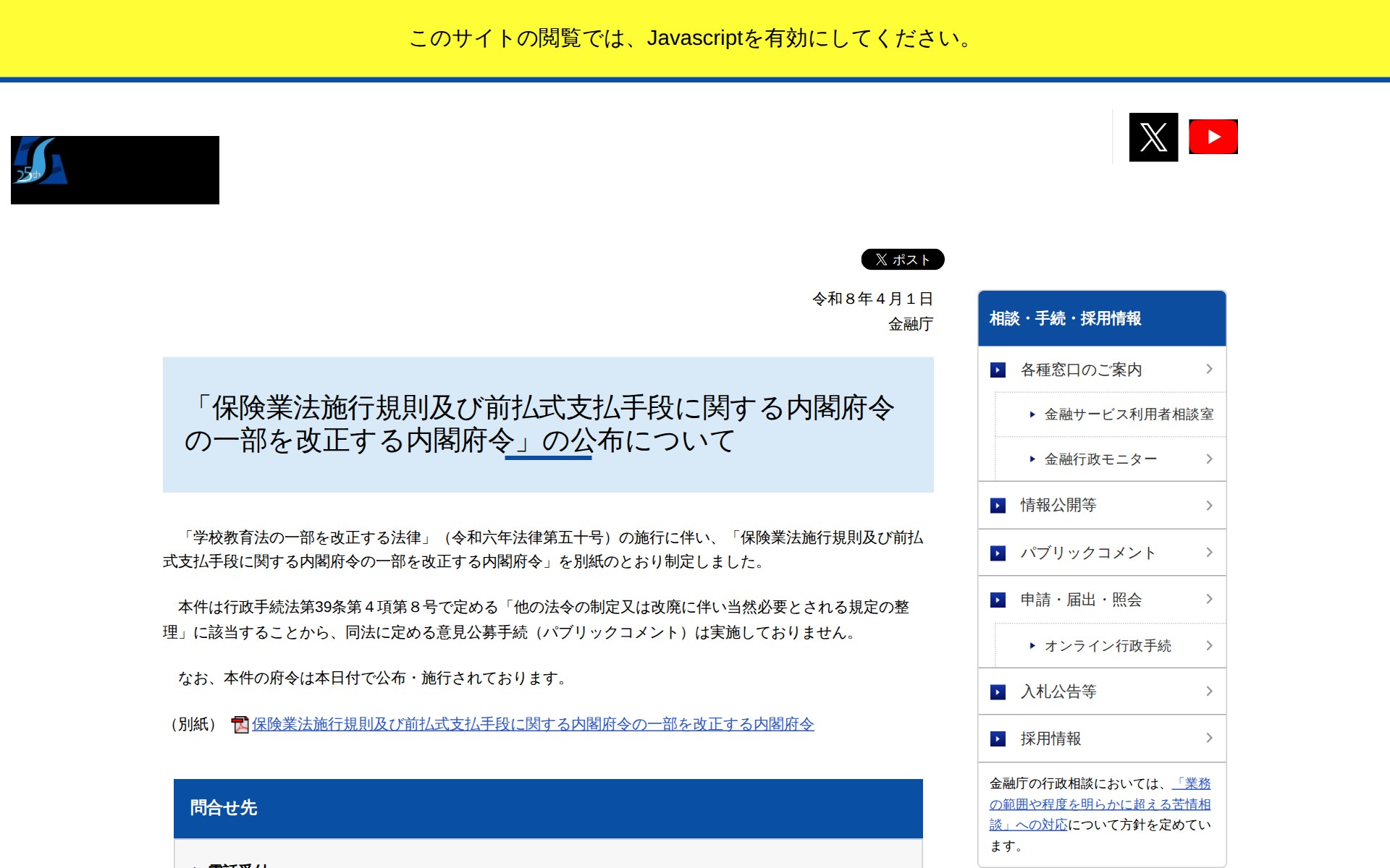 This page announces that the Financial Services Agency has enacted and promulgated an amendment to the Cabinet Office Ordinance on Insurance Business Law Enforcement Rules and Prepaid Payment Instruments. The amendment was necessary to implement the revised School Education Law enacted in June 2024. As this constitutes necessary regulatory adjustment accompanying changes to other legislation, no public comment procedure was conducted. The ordinance was promulgated and enforced on April 1, 2026.