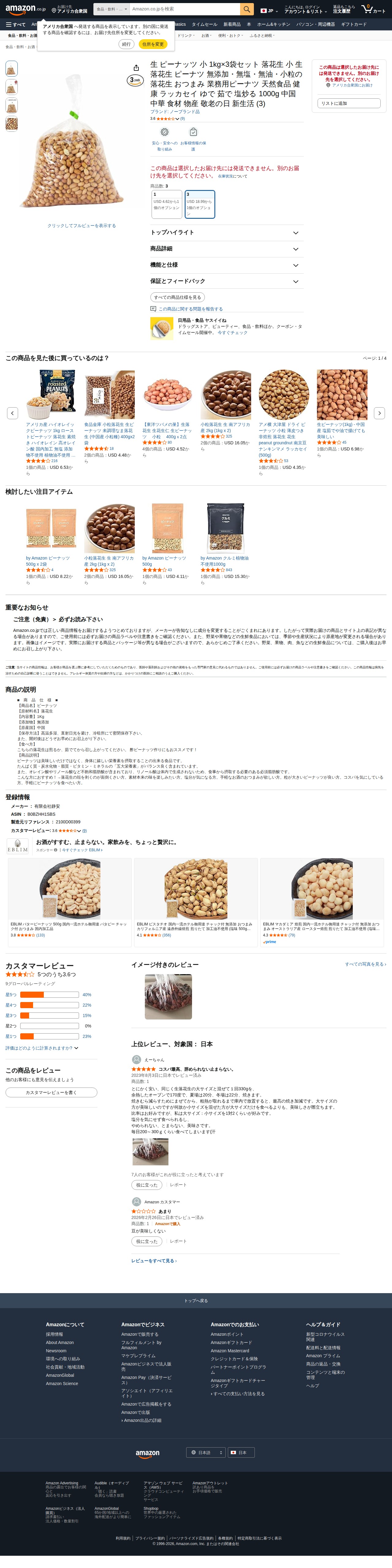 This page is an Amazon.co.jp product listing for raw peanuts (生ピーナッツ). It offers a 3kg set (1kg×3 bags) of small Chinese peanuts with no additives, salt, or oil. The product can be prepared by boiling, frying, or roasting, making it suitable as a snack or ingredient. With a 3.6-star rating from 9 reviews, it is priced from USD 18.99. The page displays related peanut products including South African and other branded options for comparison shopping.
