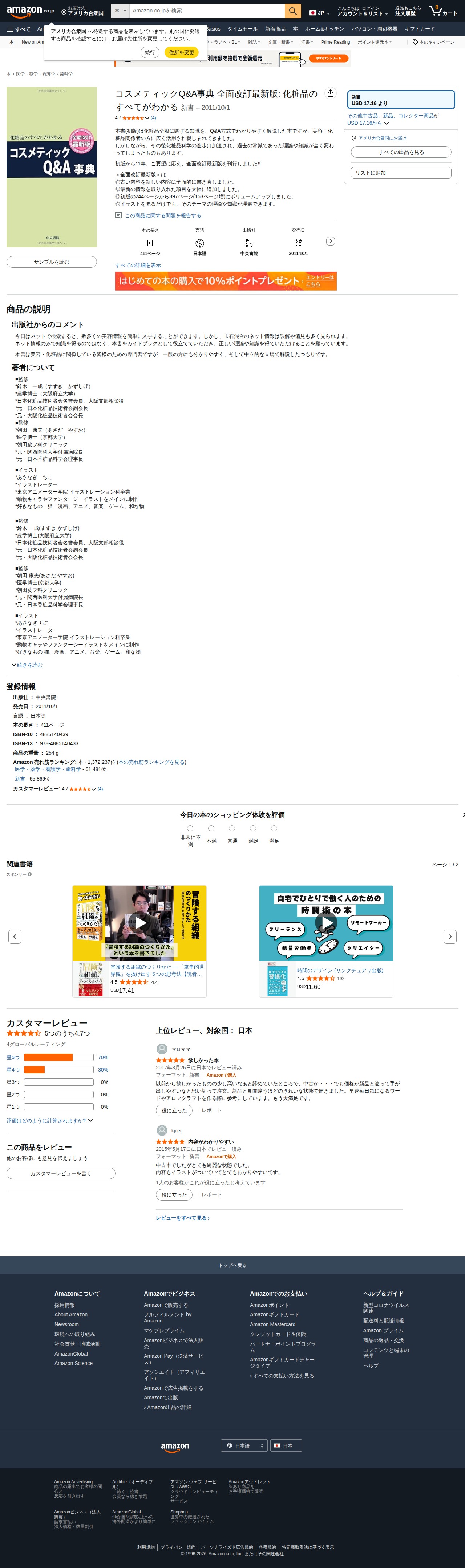 This page is a product listing on Amazon.co.jp for 'Cosmetic Q&A Dictionary Completely Revised Latest Edition,' a book explaining cosmetic knowledge through Q&A format. Originally published, the book has been completely revised 11 years later with updated information. The page number increased from 244 to 397 pages, incorporating the latest cosmetic science advancements. The book serves as a specialist reference for beauty and cosmetic professionals, yet remains accessible to general readers with a neutral perspective. Supervised by a Ph.D. in agriculture and a Ph.D. in medicine, it includes illustrations to visually convey theories and knowledge.