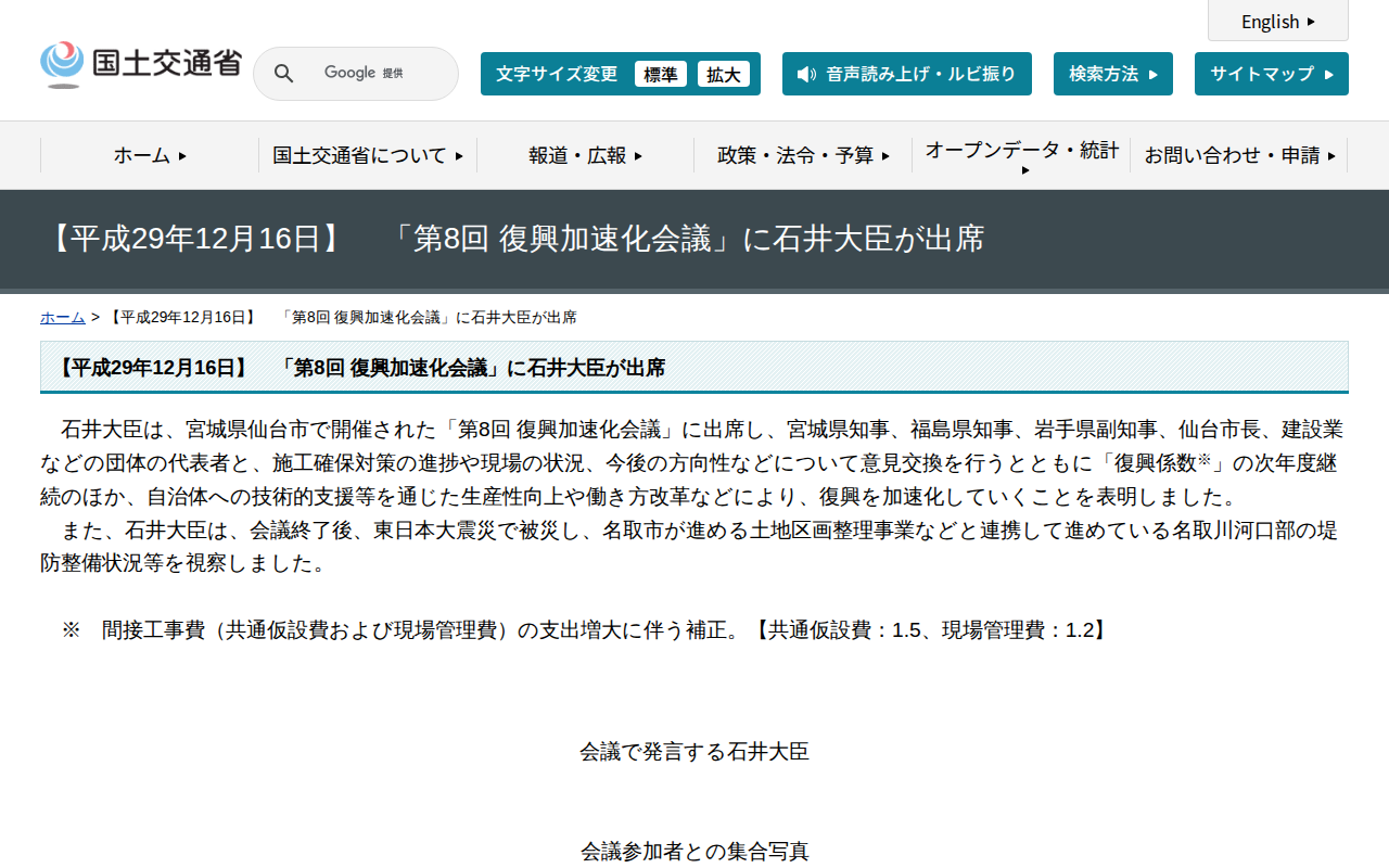 【平成29年12月16日】 「第8回 復興加速化会議」に石井大臣が出席 - 国土交通省