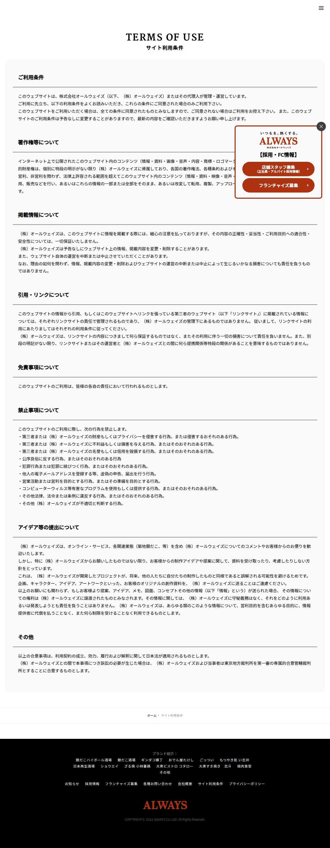 This page outlines the terms of use for a website managed by Always Co., Ltd. All content copyrights and intellectual property rights belong to the company unless otherwise stated. Unauthorized reproduction, modification, or commercial use of website content is prohibited. The company does not guarantee the accuracy of posted information and may modify or delete content without notice. Users are responsible for their own use and must not engage in illegal activities, harassment, or privacy violations. The company is not liable for damages from website changes or discontinuation. Links to third-party sites are not endorsed, and unsolicited creative ideas should not be submitted.