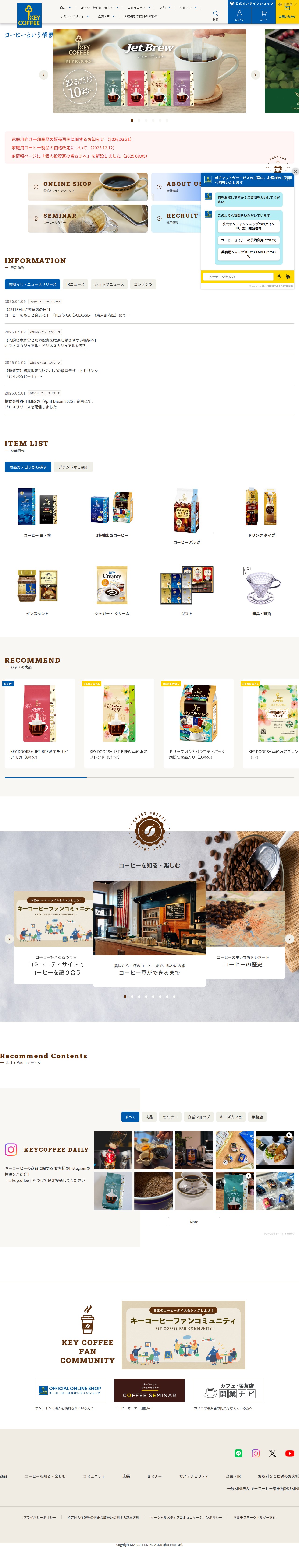 This page is the corporate website of Key Coffee Inc., a Japanese coffee company. It offers a wide range of coffee products including beans, powders, drip-type, and instant varieties through its official online shop. The site provides coffee seminars and community platforms for knowledge sharing and customer engagement. Key Coffee operates direct-sale cafés called "KEY'S CAFÉ" and supplies commercial products. The website includes company information, IR data, and recruitment details, demonstrating the company's commitment to sustainability and human capital management.