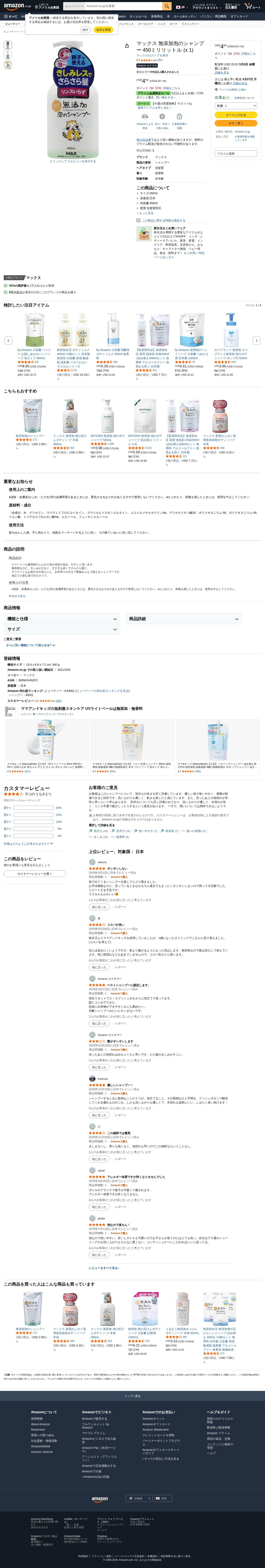 This page presents Max additive-free foam shampoo (450ml), a family-friendly product suitable for all hair types with no fragrance. Made in Japan, it is priced at $4.54 per ml. The product has a 4.1-star rating from 250 reviews and has sold over 300 units in the past month. It qualifies for Prime member sales with 2% point cashback on purchases of 5 or more items. Shipped by Amazon, it is available for delivery to the United States.