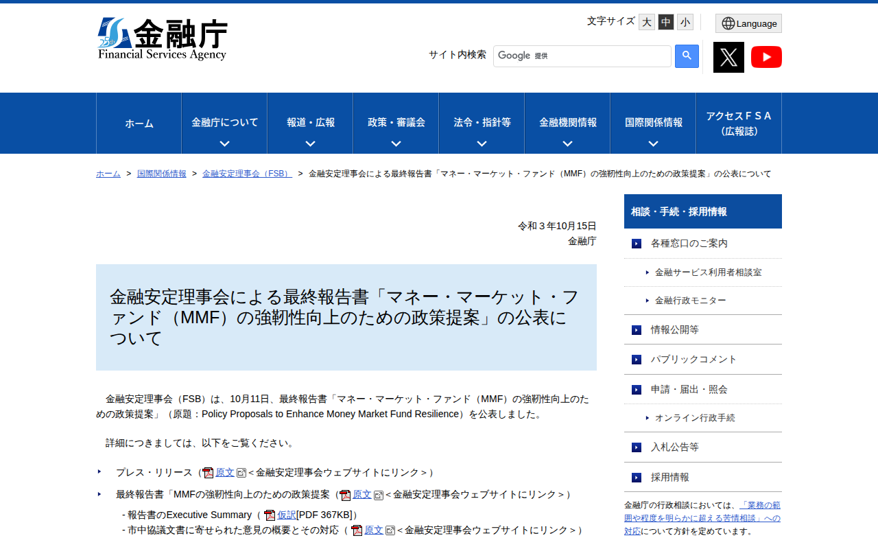金融安定理事会による最終報告書「マネー・マーケット・ファンド(MMF)の強靭性向上のための政策提案」の公表について:金融庁