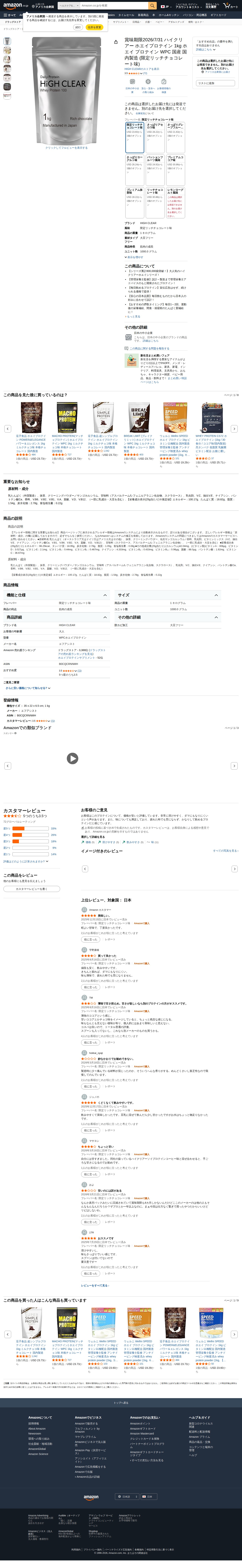 Amazon | 賞味期限2026/7/31 ハイクリアー ホエイプロテイン 1kg ホエイ プロテイン WPC 国産 国内製造 (限定リッチチョコレート味) | HIGH CLEAR | ホエイプロテイン - Saved screenshot