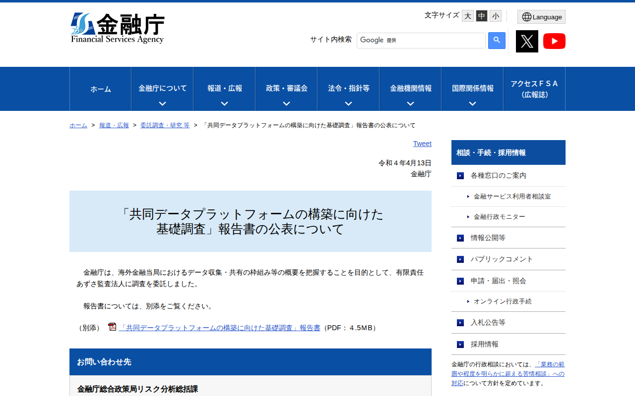 「共同データプラットフォームの構築に向けた基礎調査」報告書の公表について:金融庁