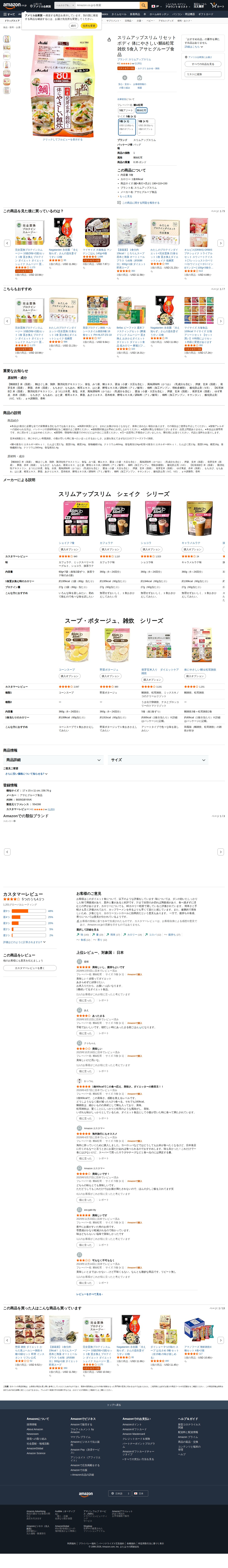 This page features the product information for "SlimUp Slim Reset Body Tai & Matsutake Zousui 5 servings" by Asahi Group Foods. It is a low-calorie porridge with only 80 kcal per serving and is a best seller in the porridge/zousui category. The product contains 5 servings and features tai fish and matsutake mushroom flavors. It is available for purchase on Amazon with a 4.1-star rating from 1,201 customer reviews. Multiple size options are offered, designed as a diet-friendly food product.