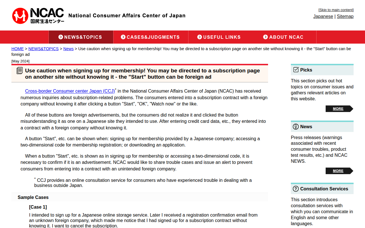 Use caution when signing up for membership! You may be directed to a subscription page on another site without knowing it - the "Start" button can be foreign ad - National Consumer Affairs Center of JAPAN -