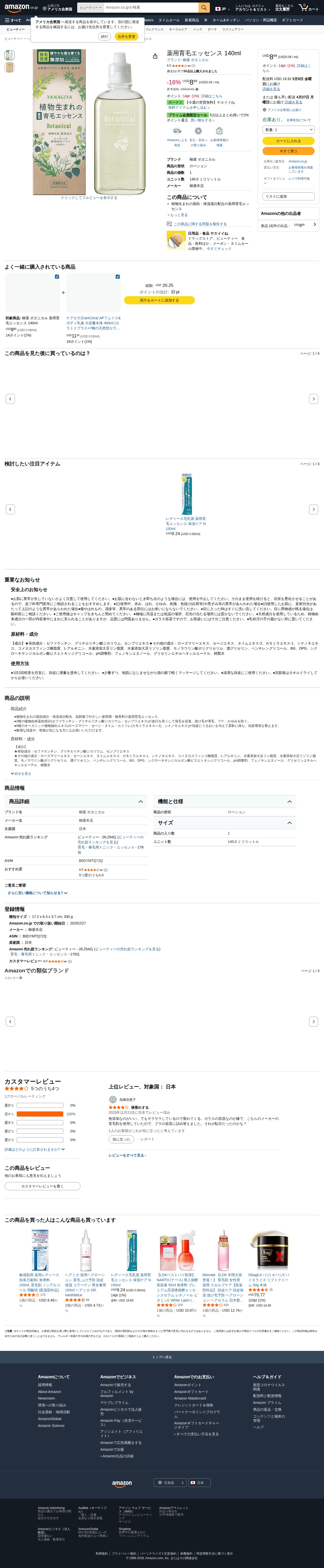 This page is an Amazon.co.jp product listing for Yanagiya Botanical Medicated Hair Growth Essence 140ml. It is a hair tonic and essence containing plant-derived medicinal and moisturizing ingredients, manufactured by Yanagiya Honten. The price is USD 8.89 (16% discount) at USD 0.06 per ml. Shipped by Amazon, the product is in stock. It has been purchased over 50 times in the past month with a 4.0 out of 5 star rating.