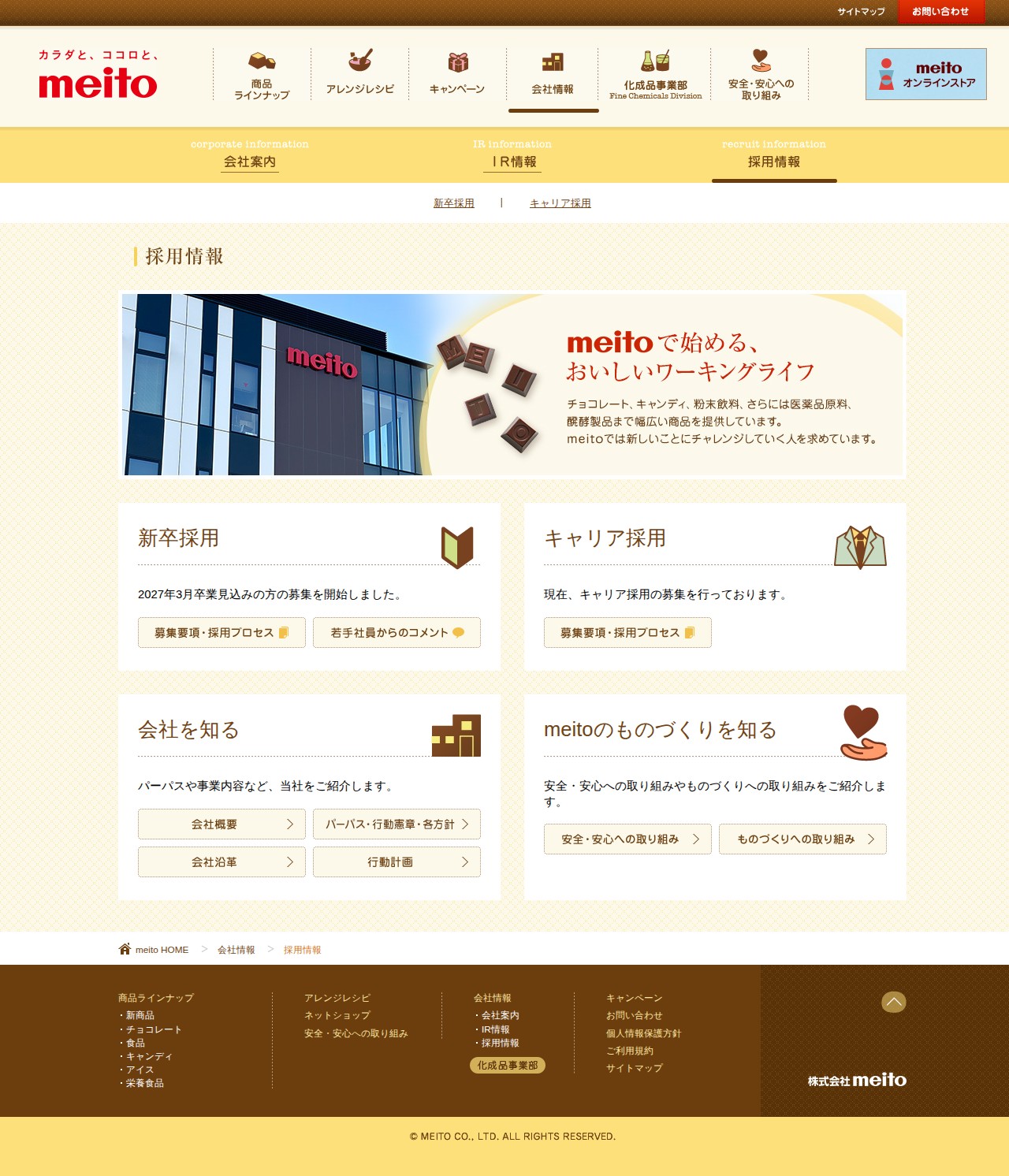 This page presents recruitment information for Meito Co., Ltd. The company is recruiting new graduates expected to graduate in March 2027 and currently accepting applications for career-track positions. The site introduces the company's purpose, business operations, and commitment to safety and quality. It showcases Meito's manufacturing approach and product lineup, including chocolates, confectionery, ice cream, and nutritional foods. The page serves as a comprehensive guide for job applicants interested in joining the company.