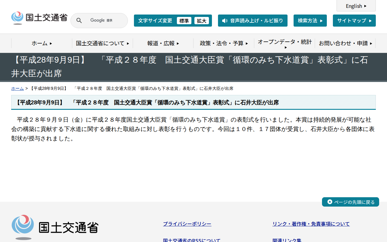 【平成28年9月9日】 「平成28年度 国土交通大臣賞「循環のみち下水道賞」表彰式」に石井大臣が出席 - 国土交通省