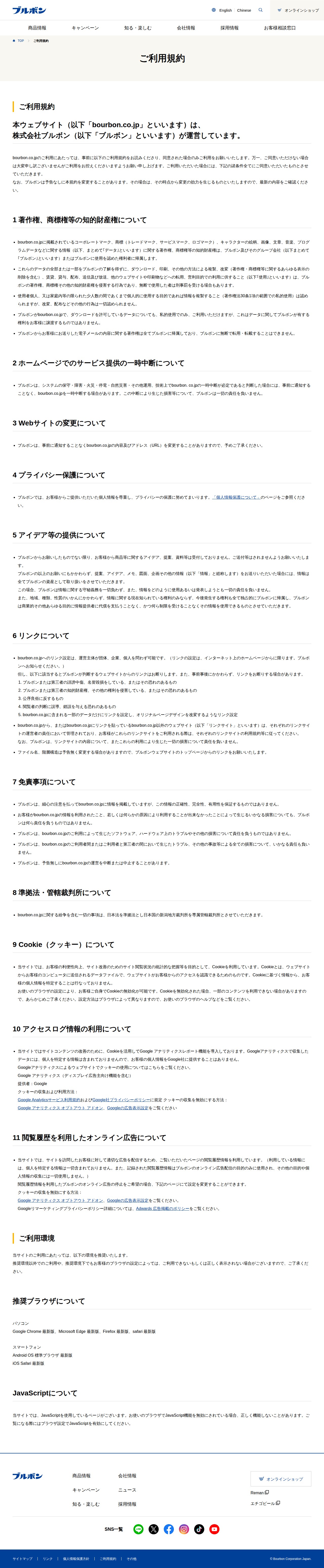 This page outlines the terms of use for bourbon.co.jp, operated by Bourbon Corporation. Users must agree to these terms before accessing the site. Bourbon reserves the right to modify terms without notice. All intellectual property rights, including trademarks, images, and text on the website, belong to Bourbon or authorized rights holders. Unauthorized reproduction, modification, or commercial use is prohibited; only private use is permitted. The site may be temporarily suspended without notice for maintenance or technical reasons, with no liability for resulting damages. Bourbon accepts no unsolicited ideas or proposals and assumes no confidentiality obligations. Any submitted information becomes Bourbon's property, usable without compensation or restrictions. Website links are generally permitted but may be declined for inappropriate sites.