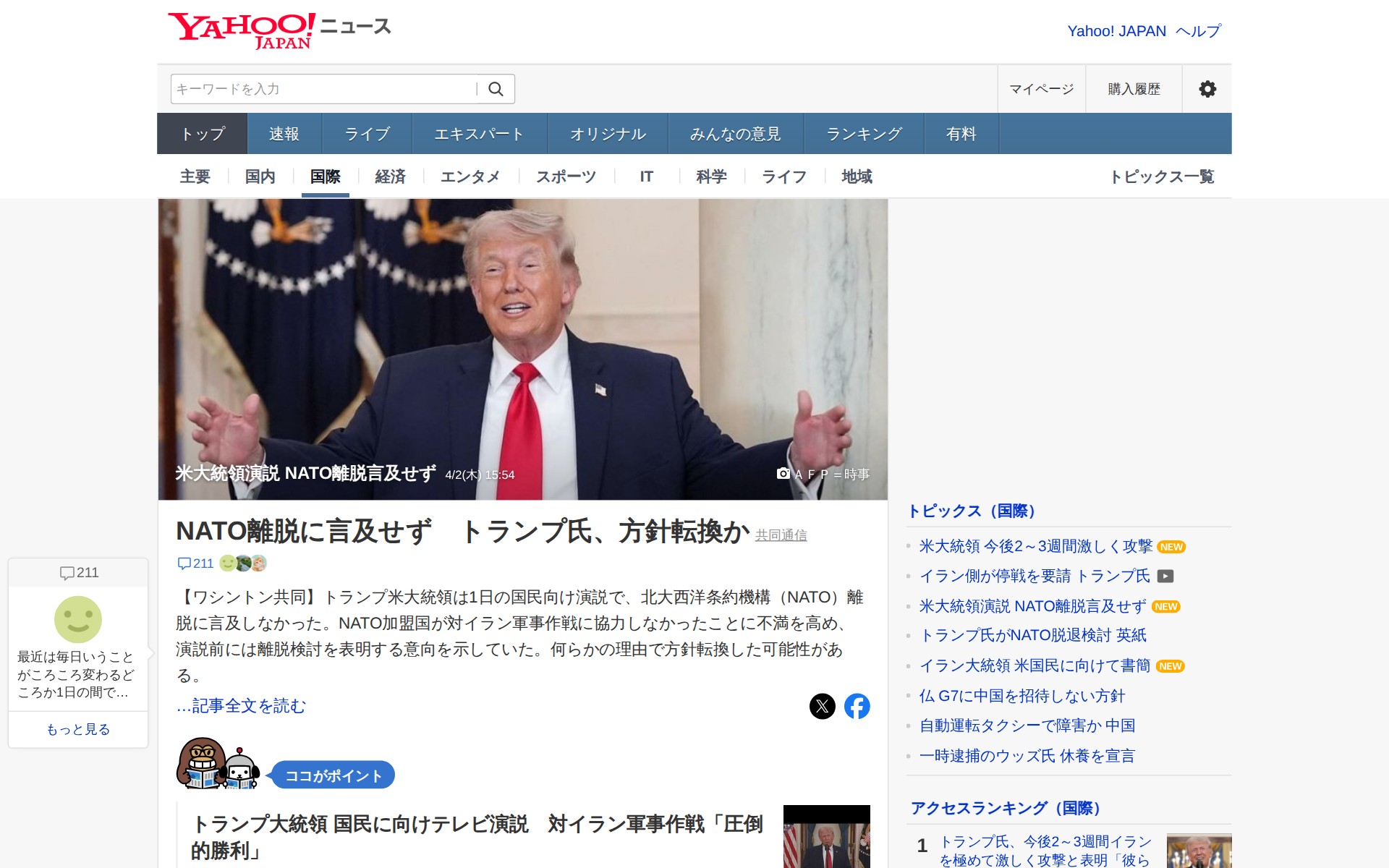 米大統領演説 NATO離脱言及せず - Yahoo!ニュース - Saved screenshot