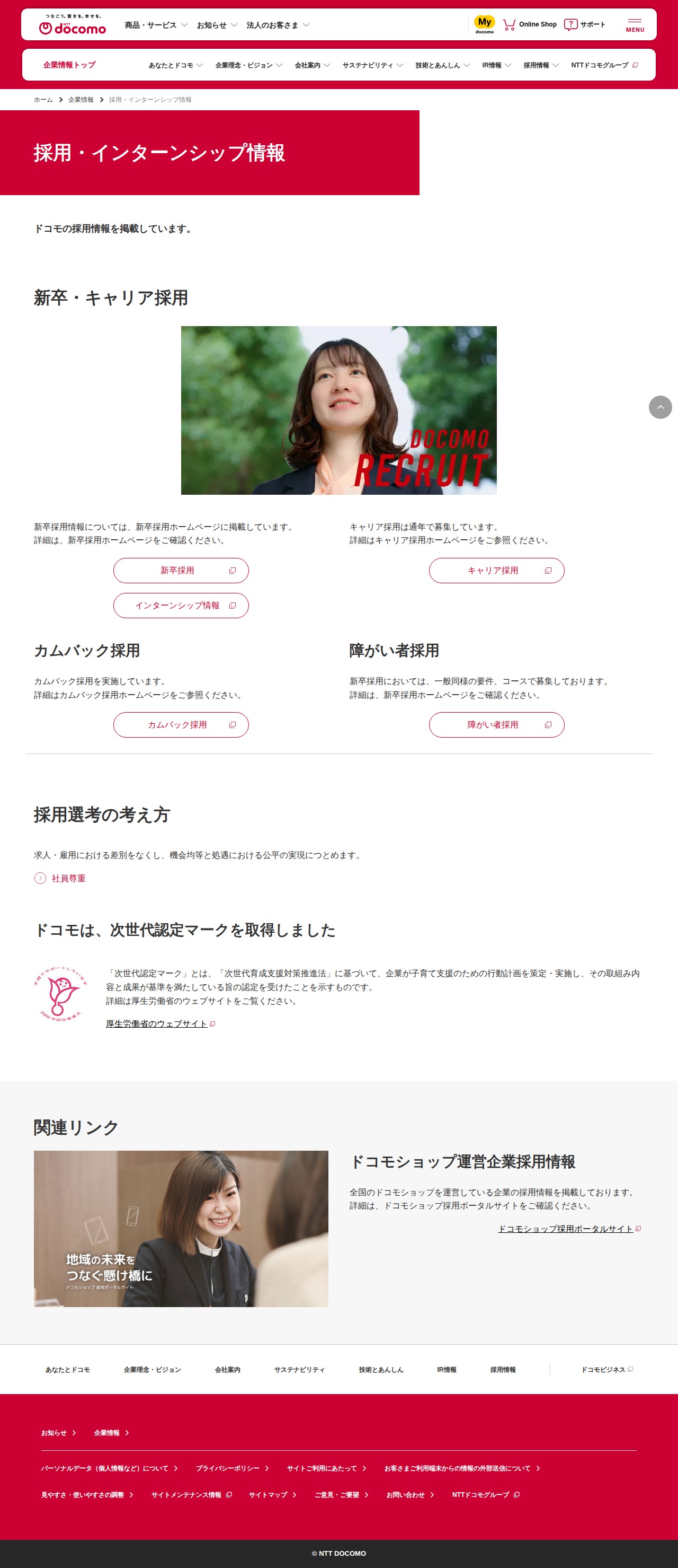 This page presents NTT DoCoMo's recruitment and internship information. New graduate and career recruitment details are available on separate homepages, with career positions recruited year-round. The company also offers comeback recruitment and employment for people with disabilities, maintaining equal opportunity policies. DoCoMo has obtained the Next Generation Certification Mark, demonstrating commitment to child-rearing support. Additionally, recruitment information for companies operating DoCoMo shops nationwide is provided separately on a dedicated portal site.