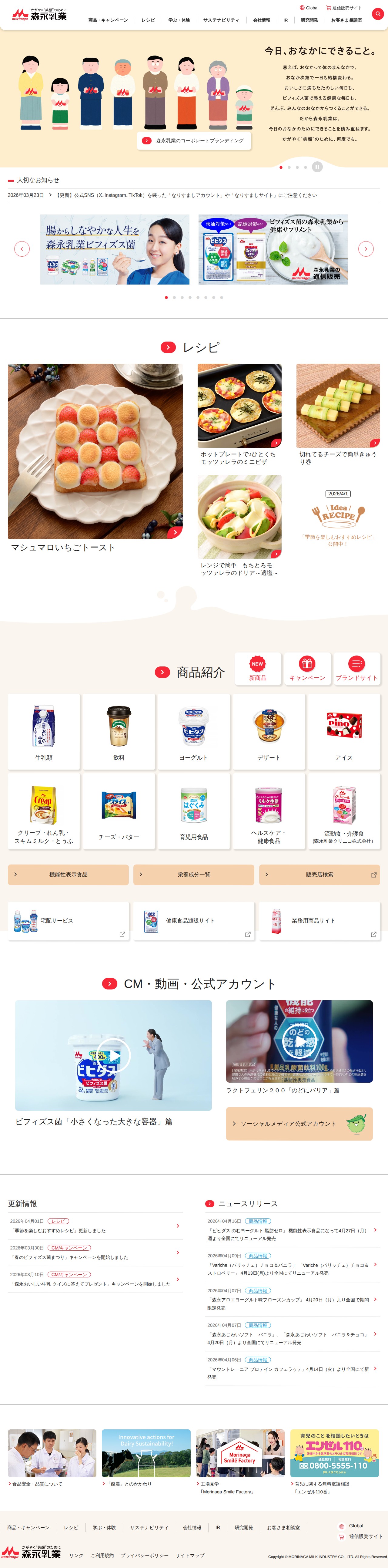 This page is the official website of Morinaga Milk Industry Co., Ltd. The company aims to support health of both mind and body while contributing to happiness through food enjoyment. It offers diverse dairy products including milk, yogurt, cheese, and ice cream. The company focuses on Bifidobacterium research and sustainability, with flagship products like Bifidus yogurt. The site features recipes, new product information, and campaigns. Consumer services including factory tours and free childcare consultations are also provided.