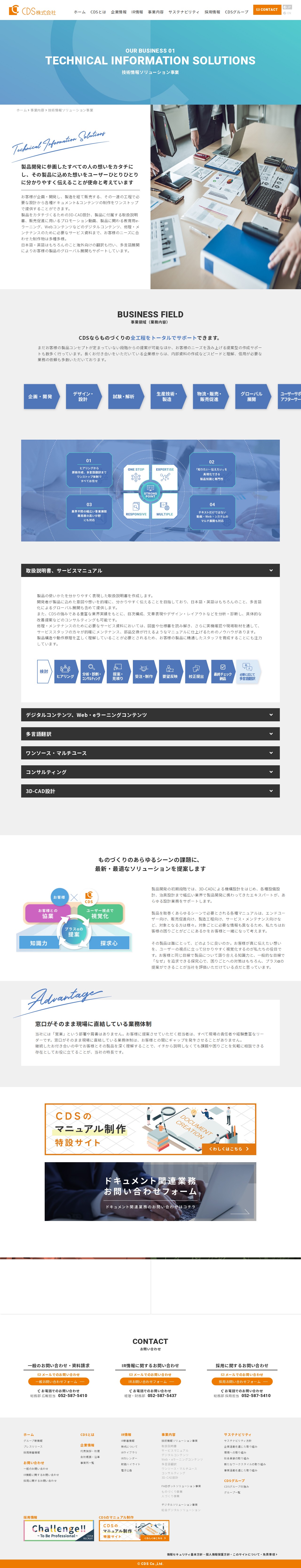 This page describes CDS Corporation's Technical Information Solutions business. The company provides one-stop support for all stages from product development to sales, including 3D-CAD design, instruction manuals, promotional videos, e-learning content, web content, and service materials. It offers multilingual translation services to support global expansion. The company creates various manuals tailored for end-users, sales promotion, manufacturing, and maintenance. Notable is its organizational structure without a separate sales department—account managers are experienced leaders directly connected to operations, enabling deep product understanding and seamless customer collaboration.