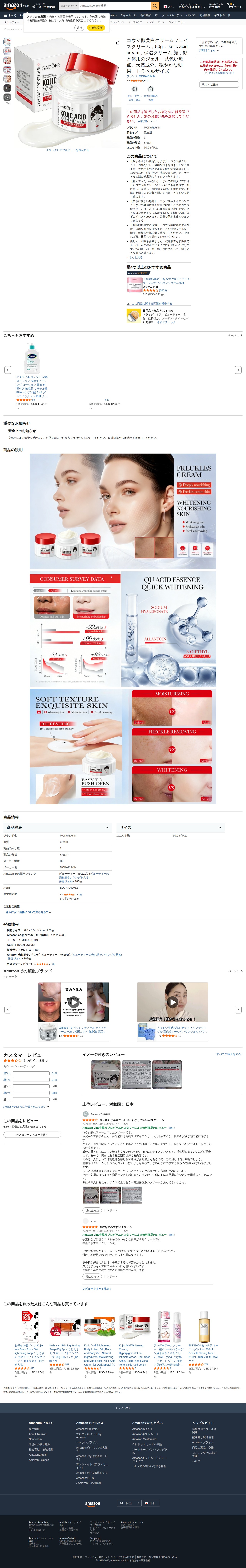 This page features a kojic acid brightening cream facial gel by MOKARUYIN on Amazon. The 50g travel-size product is suitable for all skin types, including combination skin. It contains natural ingredients such as kojic acid, niacinamide, and sodium hyaluronate for whitening and moisturizing benefits. The lightweight gel formula absorbs quickly without leaving a greasy residue and provides long-lasting hydration. It's designed to address brown spots and is recommended for use on the face, elbows, underarms, and knees. The product has a 3.5-star rating.