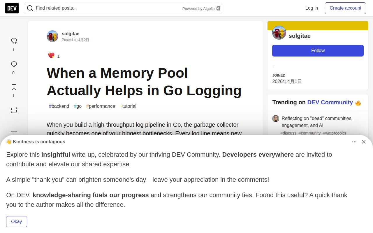 When a Memory Pool Actually Helps in Go Logging - DEV Community - Saved screenshot