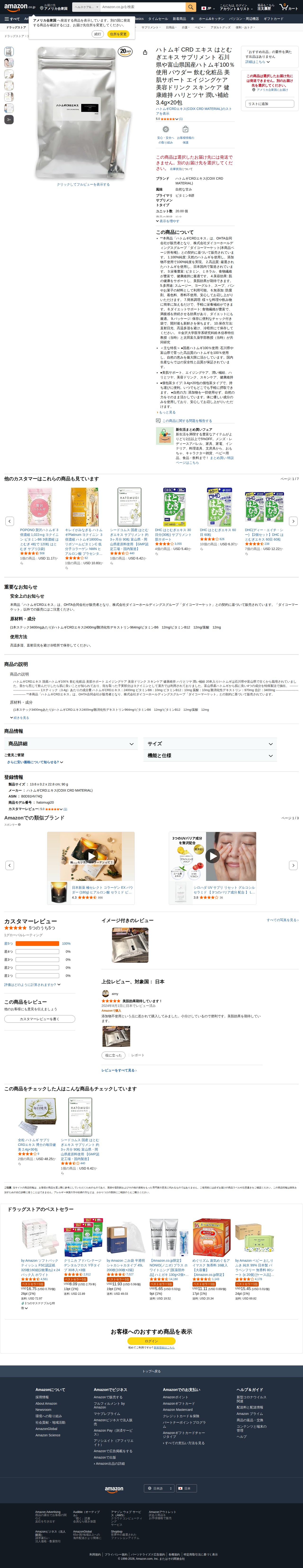 Amazon | ハトムギ CRD エキス はとむぎエキス サプリメント 石川県や富山県国産ハトムギ100%使用 パウダー 飲む化粧品 美肌サポート エイジングケア 美容ドリンク スキンケア 健康維持 ハリとツヤ 潤い補給 3.4g×20包 | ハトムギCRDエキス(COIX CRD MATERIAL) | サプリメント・ビタミン - Saved screenshot