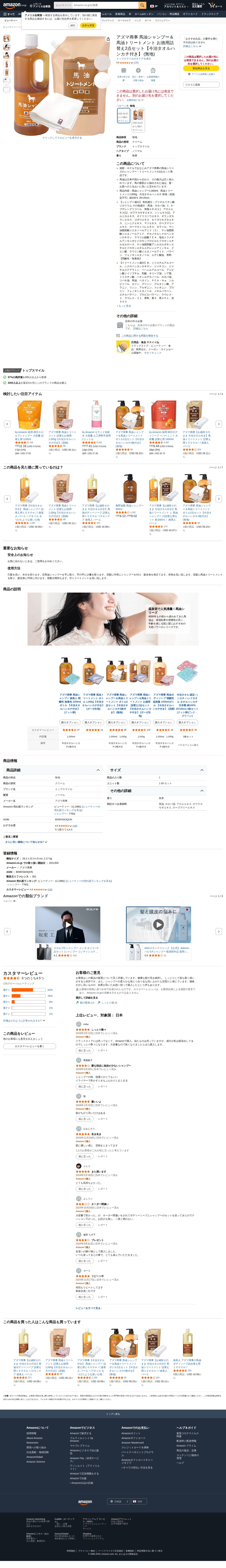 This page presents Azuma Shoji's horse oil shampoo and treatment set, a popular product used in ryokans and hotels. The set contains 1,000ml of horse oil shampoo, 1,000g of treatment, and an Imabari towel handkerchief. Horse oil, derived from horse fat and traditionally used in China, is known for moisturizing hair and skin. The shampoo is weakly acidic and colorless, containing glycyrrhizin potassium as an active ingredient, plus horse oil, jojoba oil, seaweed extract, and various plant extracts. The product has a 4.5-star rating from 125 customer reviews.