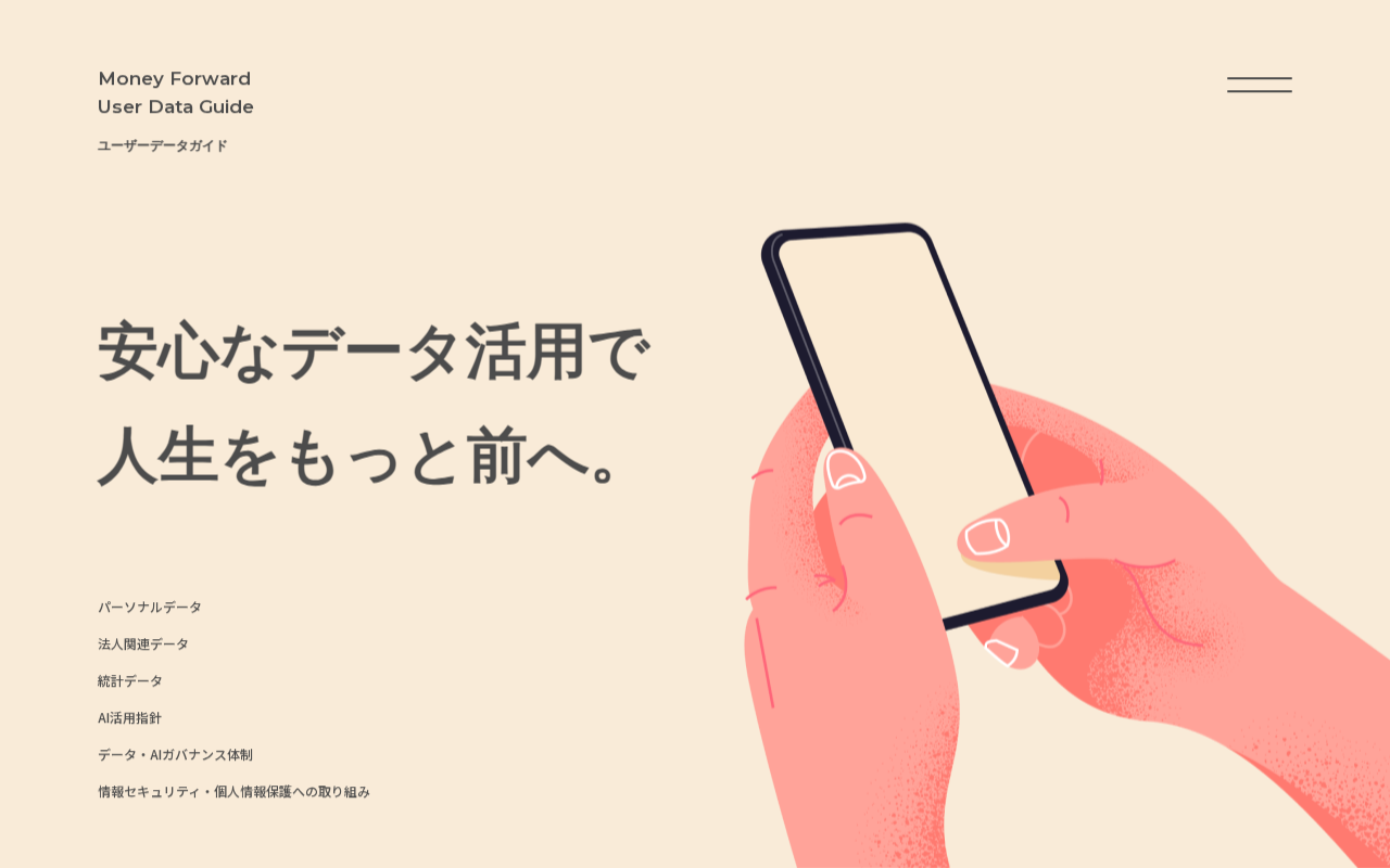 This page is Money Forward Group's User Data Guide explaining how user data is utilized and protected. It desc...