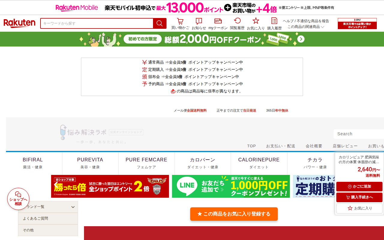 This page is a Rakuten Marketplace product listing for "Calorin Pure," a dietary supplement containing ellagic...