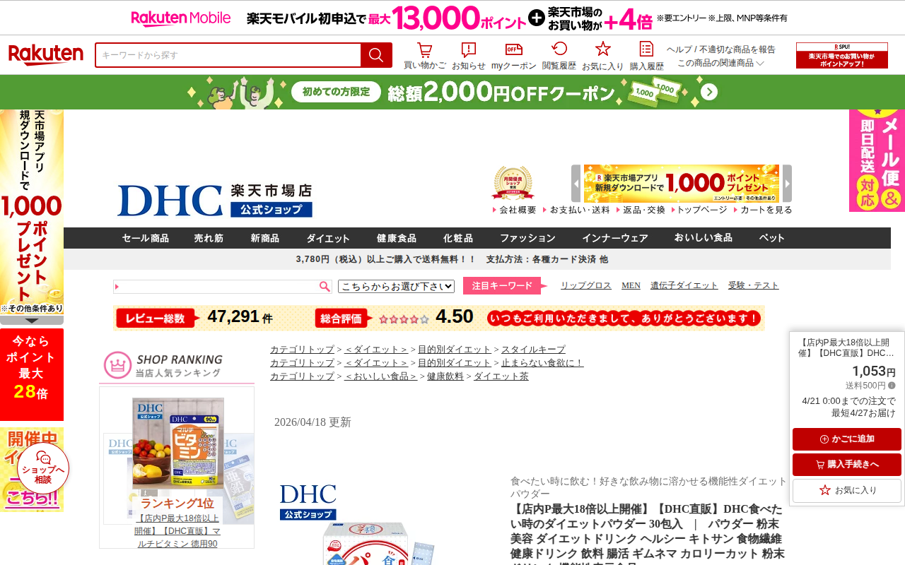 This page presents DHC's "Diet Powder for When You Want to Eat" (30 packets) priced at 1,053 yen. It is a func...