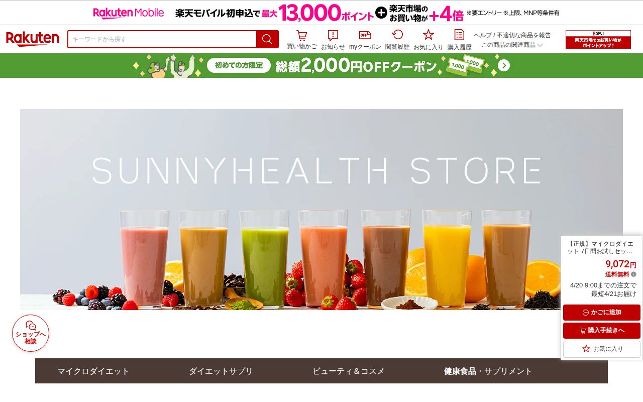 This page showcases a 7-day trial set of Microdiet available on Rakuten Market, priced at 9,072 yen with free ...