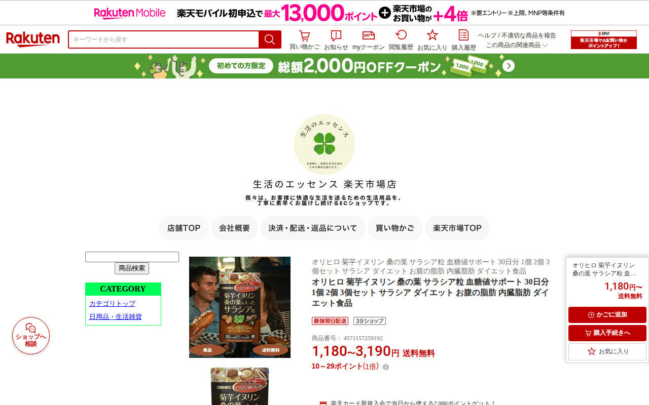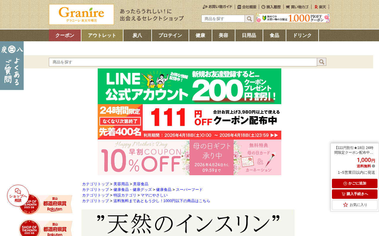 This page is a product listing on Rakuten Market for Orihiro's Chrysanthemum Inulin Mulberry Leaf Salacia Gran...