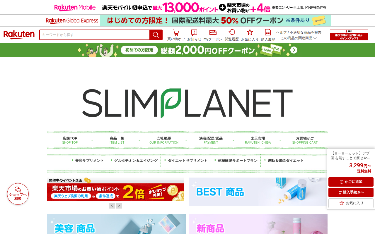 This page displays a product listing on Rakuten Market for "Tabete mo Dossari Slim 80 Capsules" (250mg per cap...