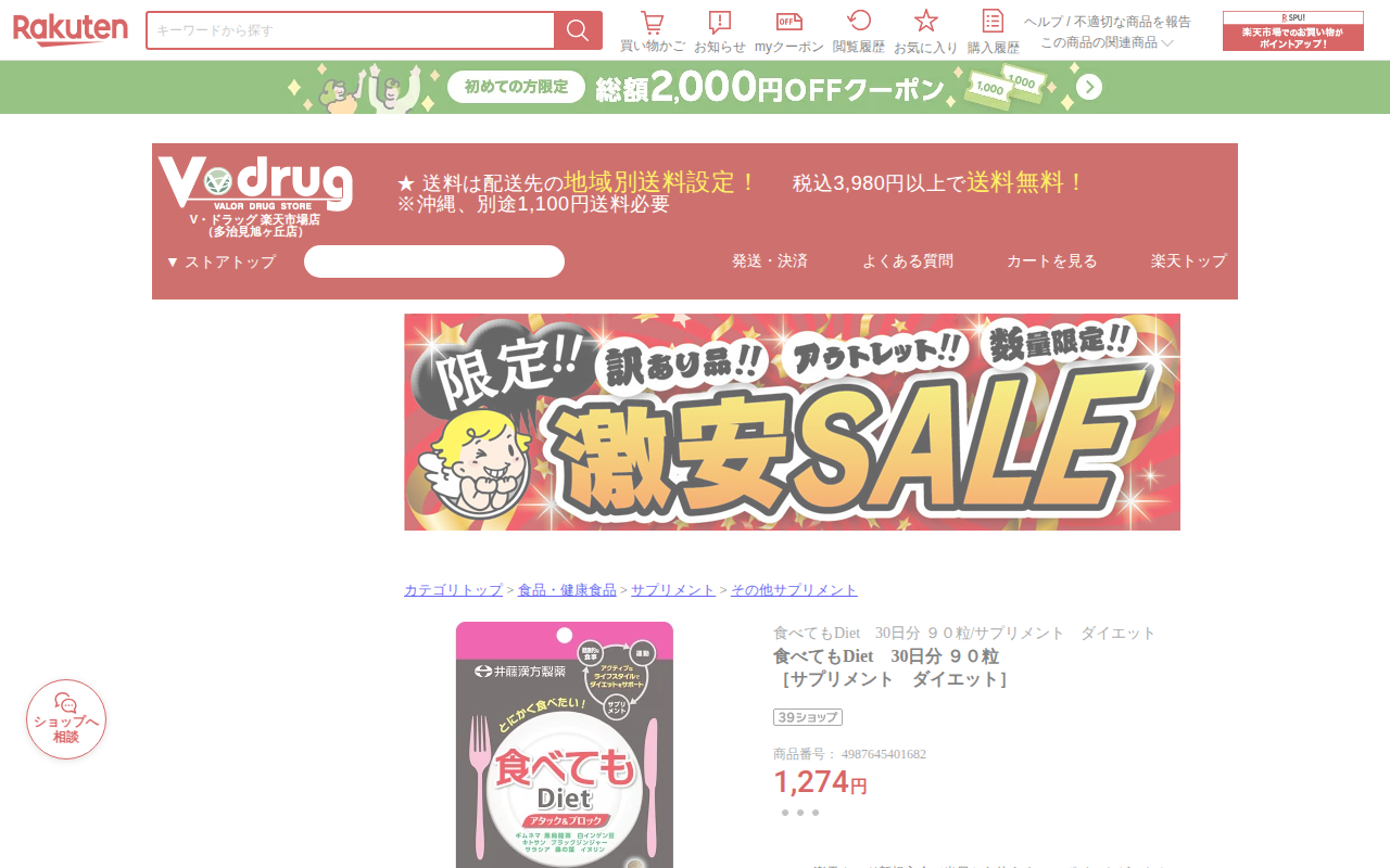 【楽天市場】食べてもDiet 30日分 90粒[サプリメント ダイエット]:Vドラッグ 楽天市場店