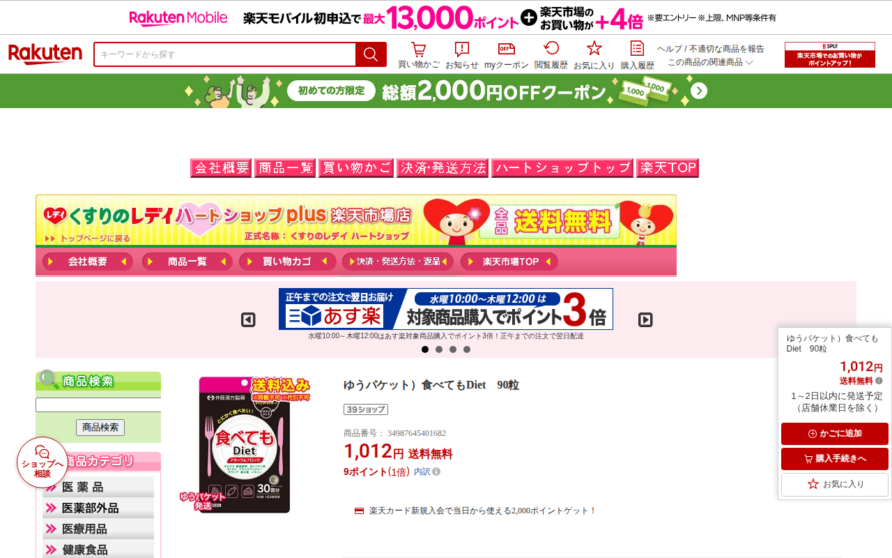 【楽天市場】ゆうパケット)食べてもDiet 90粒:くすりのレデイハートショップplus