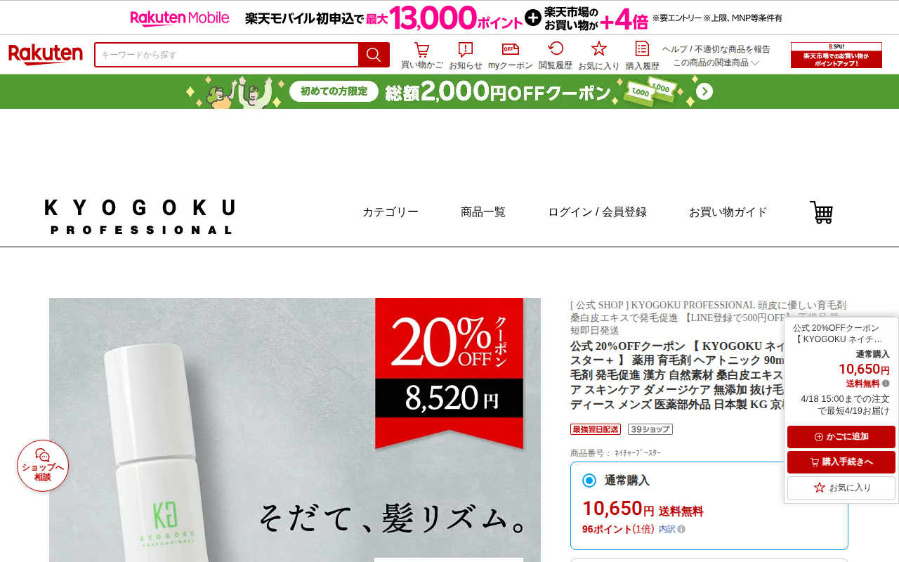 【楽天市場】公式 20%OFFクーポン 【 KYOGOKU ネイチャーブースター+ 】 薬用 育毛剤 ヘアトニック 90ml 発毛剤 育毛剤 発毛促進 漢方 自然素材 桑白皮エキス AGA 頭皮ケア スキンケア ダメージケア 無添加 抜け毛 薄毛予防 レディース メンズ 医薬部外品 日本製 KG 京極:KYOGOKU PROFESSIONAL