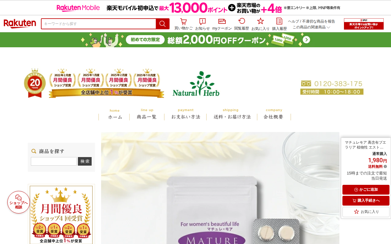 This page presents a product listing for Maturemoa High-Content Pueraria supplement on Rakuten Market. It is a...