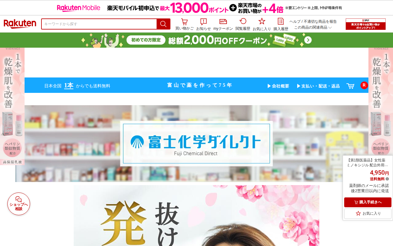 This page showcases a female hair loss treatment product on Rakuten Marketplace: "Minoxidil Topical Solution 1...
